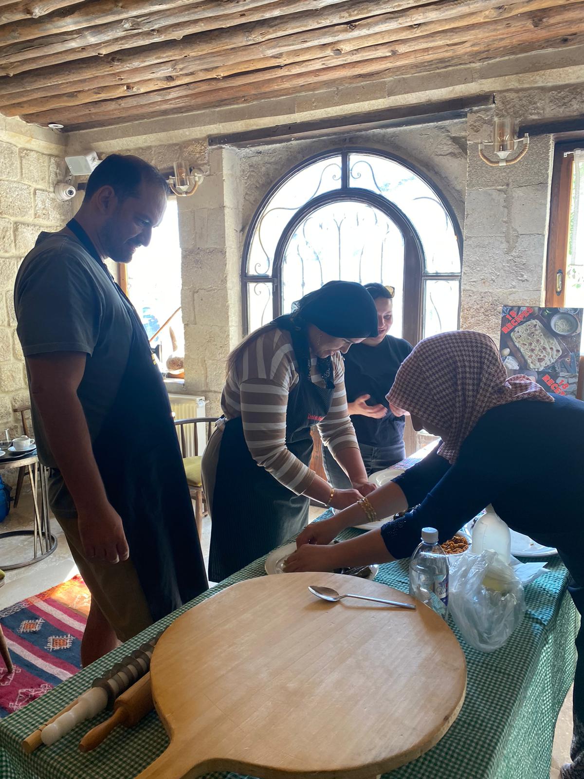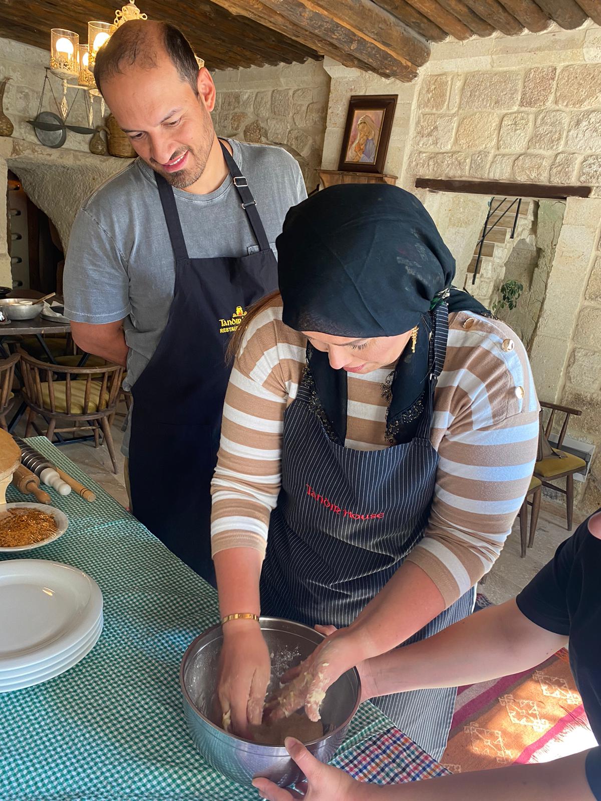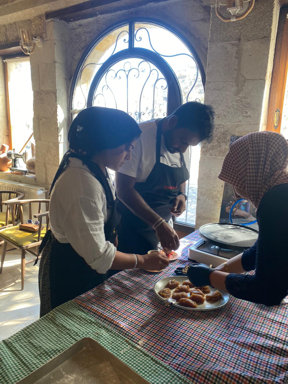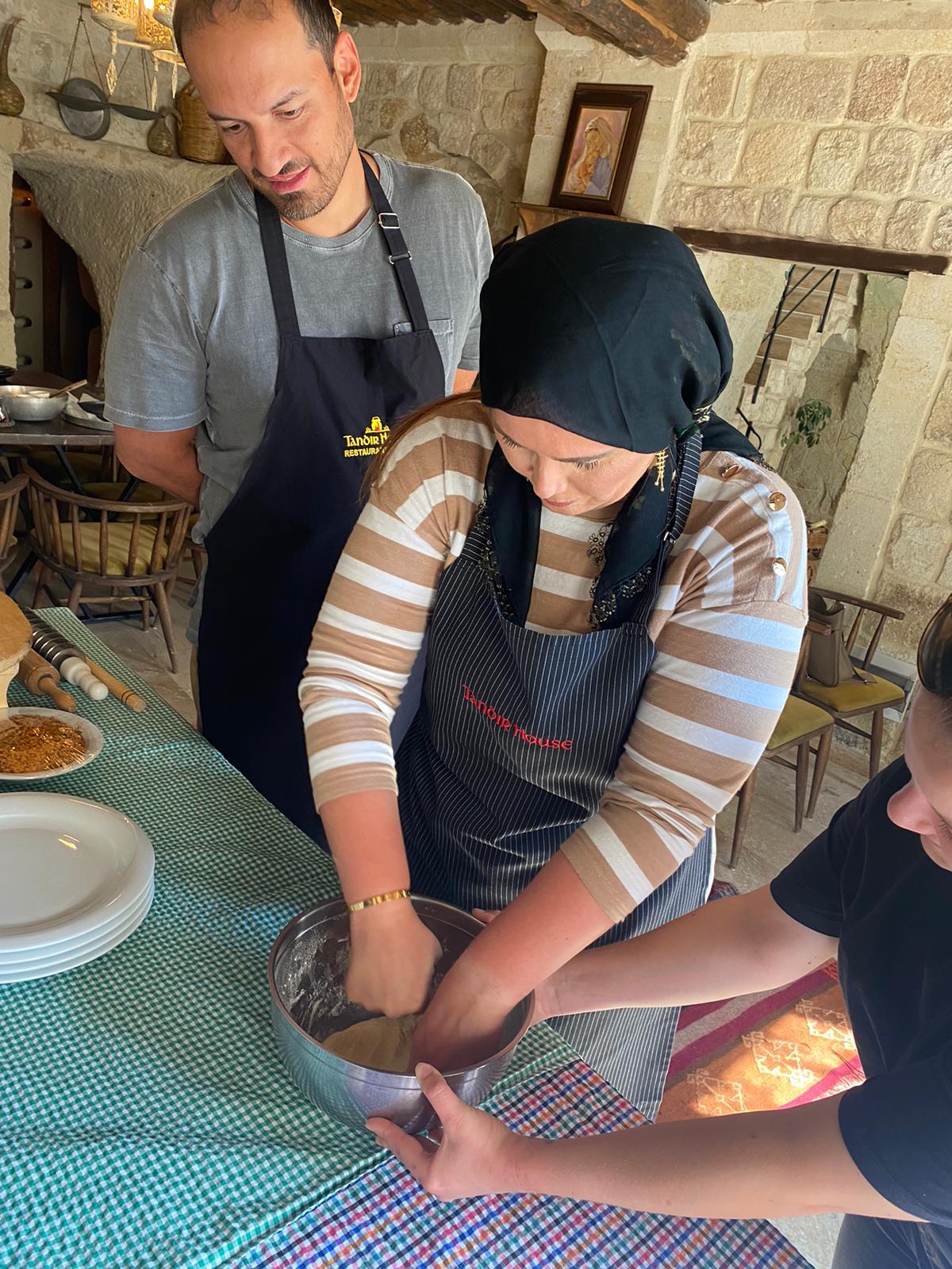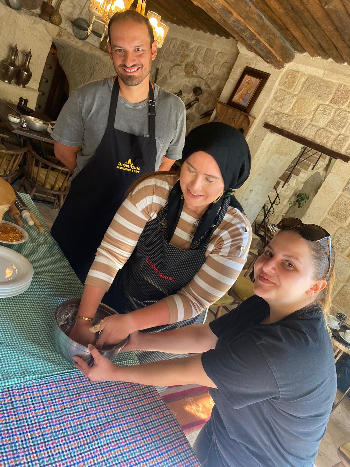 Sabah saat 10 civarında restoranımıza gelmiş oluyorlar; genellikle iş başlangıç saatimiz 10. İlk olarak, bazlama ekmeği ve mantı için hamur yoğruluyor. Ardından yaprak sarması hazırlanmaya başlanıyor. Hamur dinlendikten sonra bazlama ekmeği yapılıyor ve ardından mantı sıkma işlemi gerçekleştiriliyor. İçli köfte için harç hazırlanıyor ve içli köfte yapımına geçiliyor. Eğer testi kebabı istenirse, testi hazırlığı yapılıp pişiriliyor. Bu işlem isteğe bağlı olarak yapılır ve ek ücretlendirme uygulanır. Ayrıca, hazırlık süresi yaklaşık 1 saat daha uzar. Son olarak, tatlı olarak Aside hazırlanıyor.
