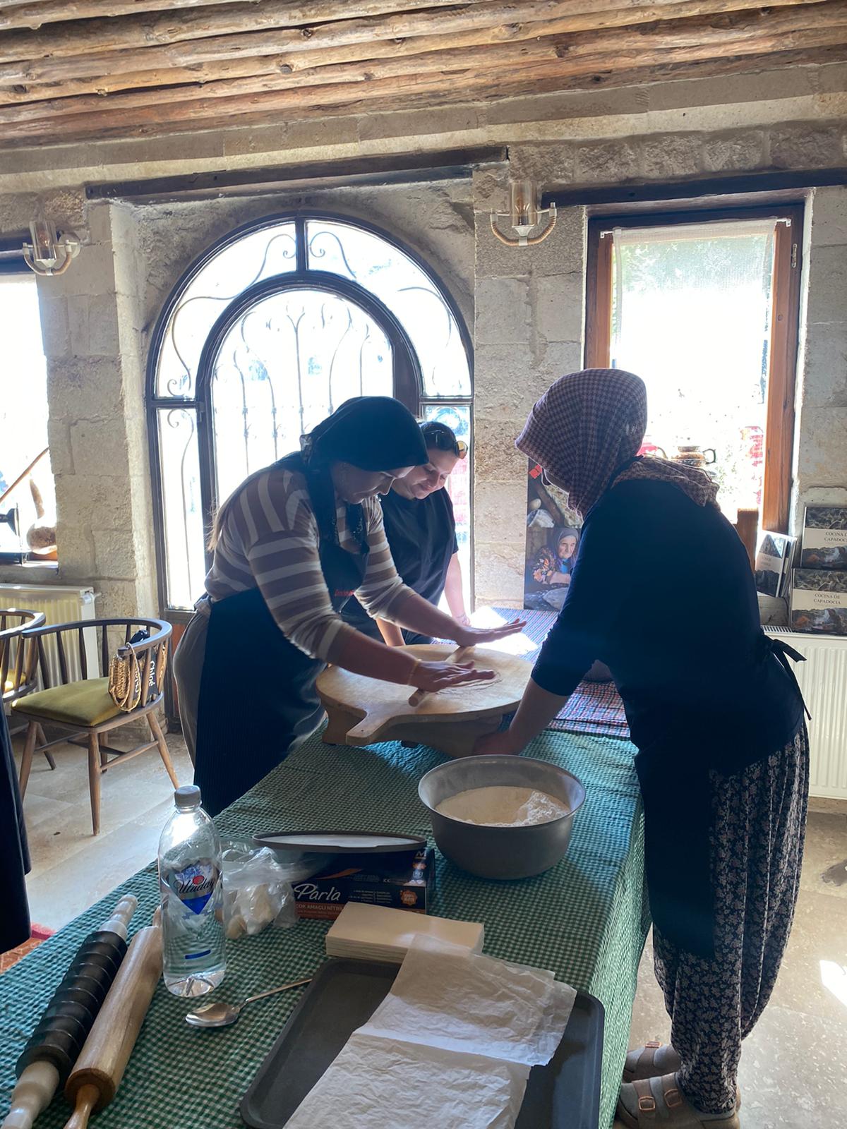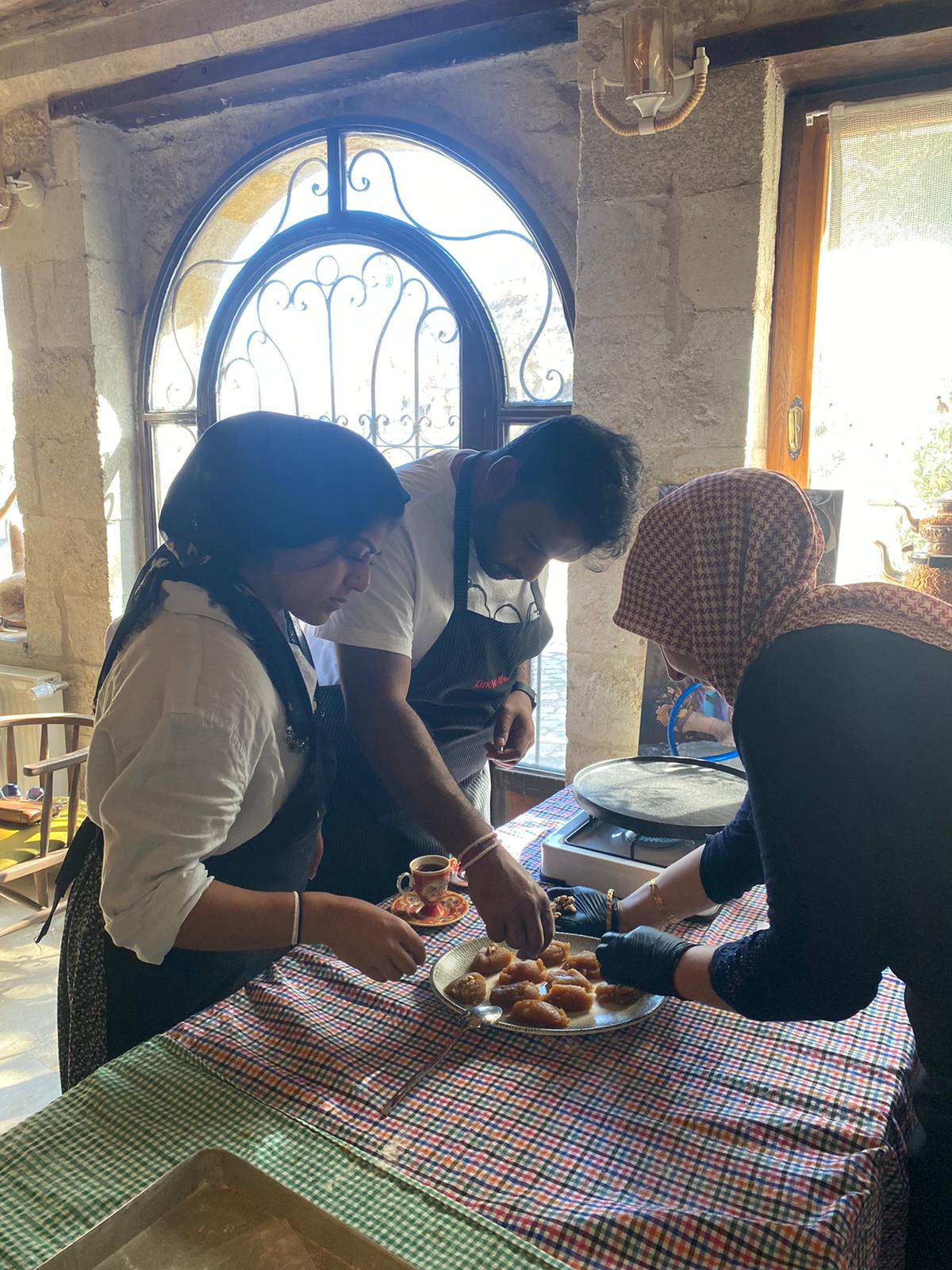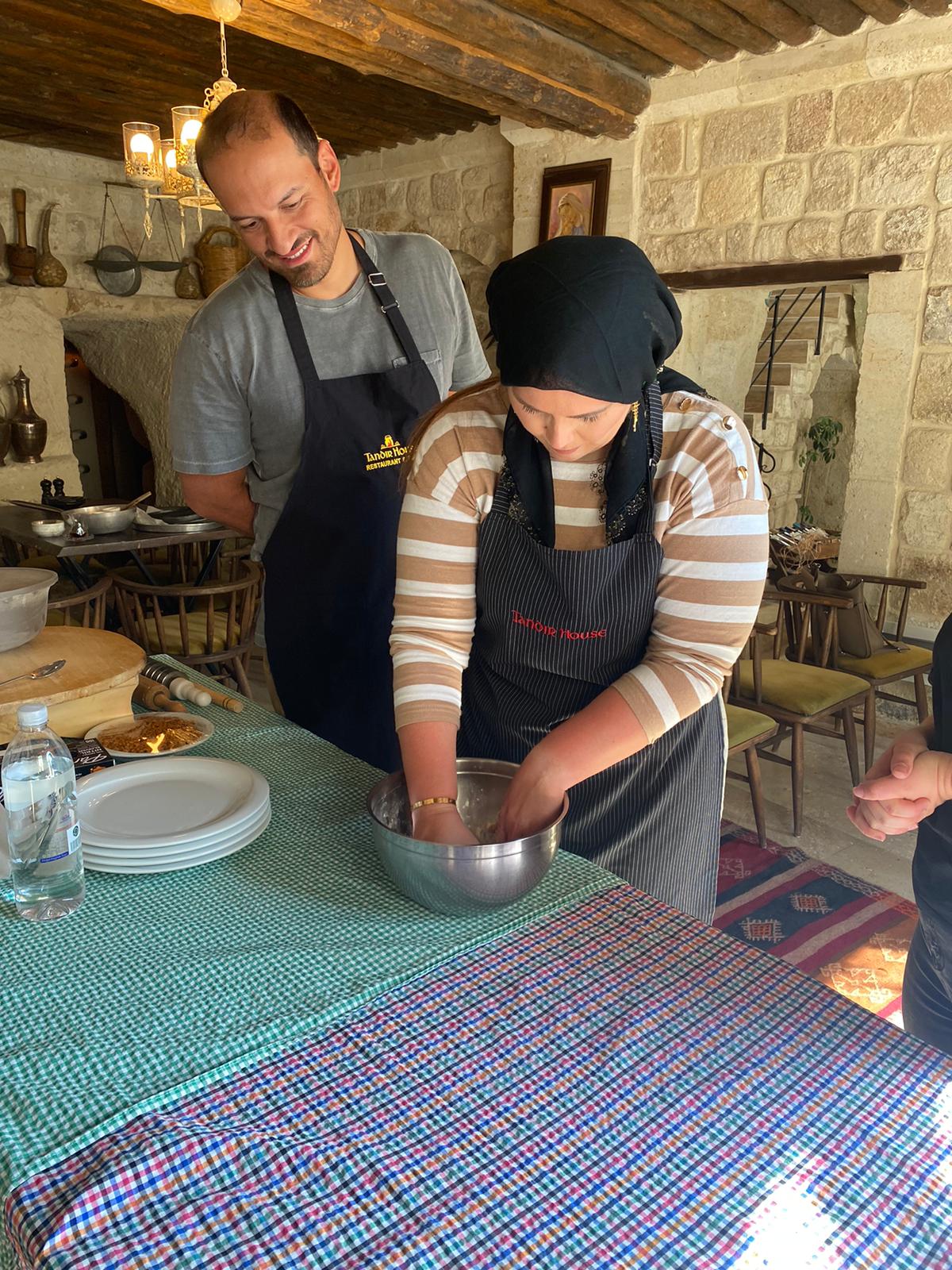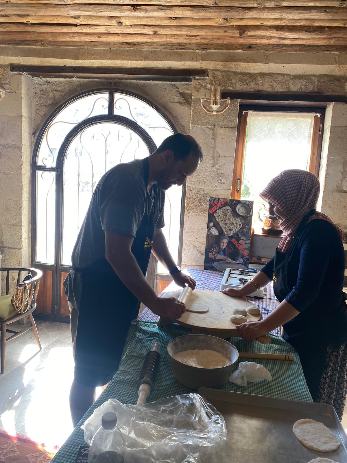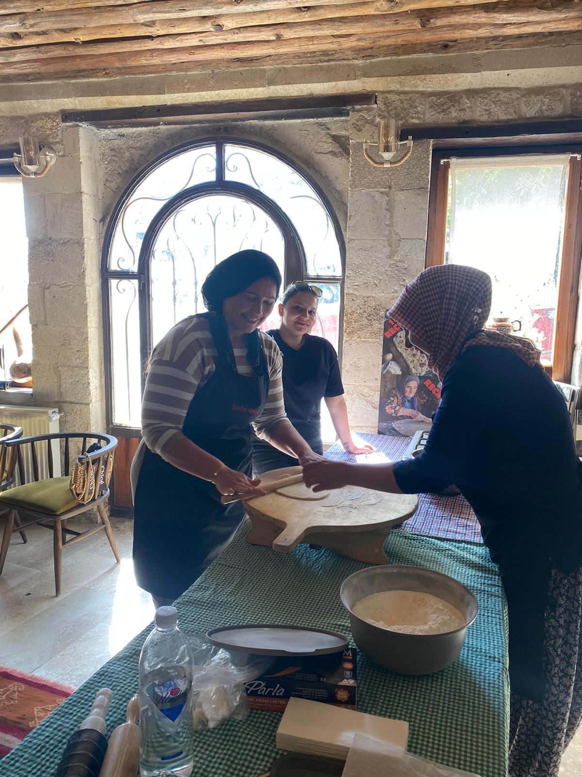 Sabah saat 10 civarında restoranımıza gelmiş oluyorlar; genellikle iş başlangıç saatimiz 10. İlk olarak, bazlama ekmeği ve mantı için hamur yoğruluyor. Ardından yaprak sarması hazırlanmaya başlanıyor. Hamur dinlendikten sonra bazlama ekmeği yapılıyor ve ardından mantı sıkma işlemi gerçekleştiriliyor. İçli köfte için harç hazırlanıyor ve içli köfte yapımına geçiliyor. Eğer testi kebabı istenirse, testi hazırlığı yapılıp pişiriliyor. Bu işlem isteğe bağlı olarak yapılır ve ek ücretlendirme uygulanır. Ayrıca, hazırlık süresi yaklaşık 1 saat daha uzar. Son olarak, tatlı olarak Aside hazırlanıyor.