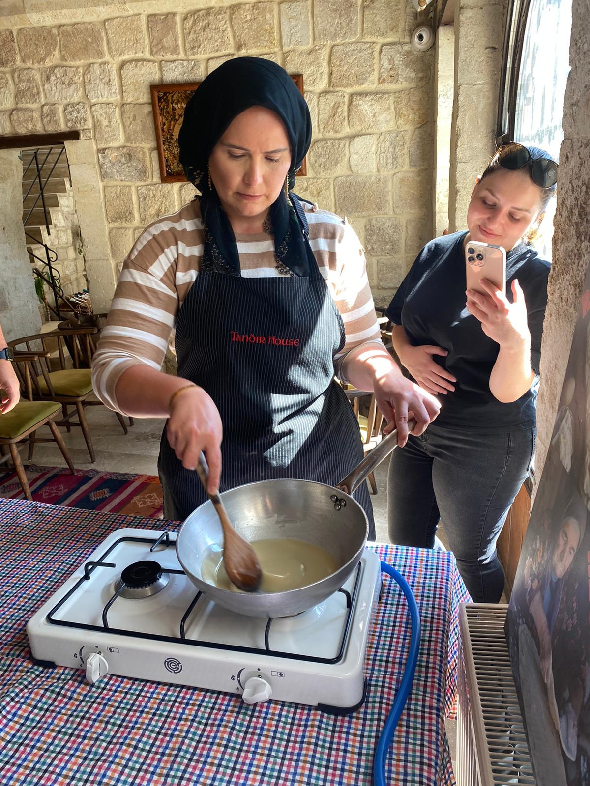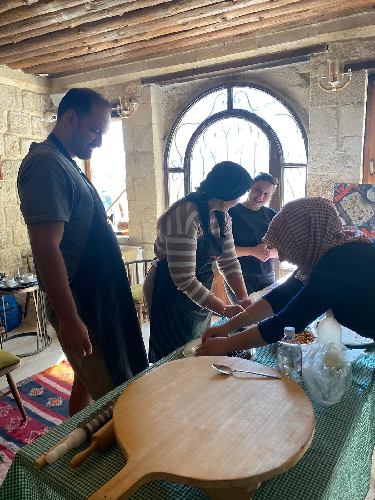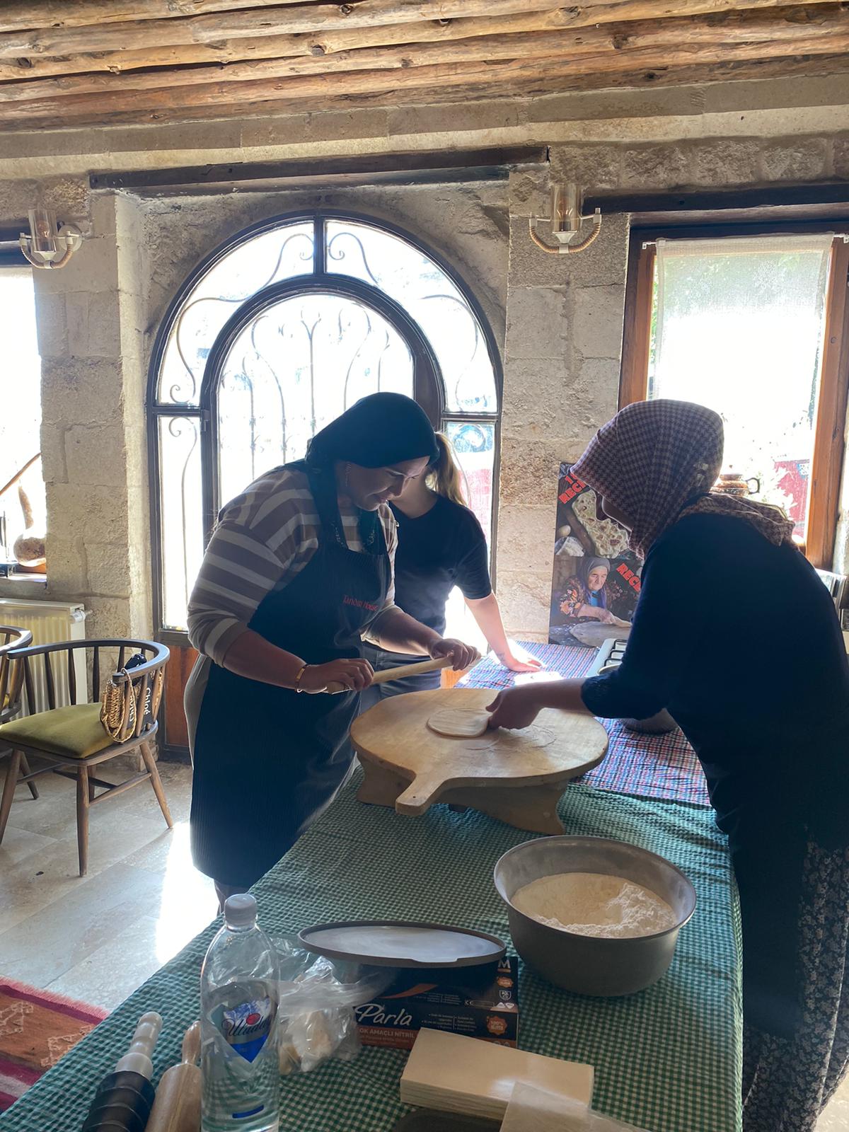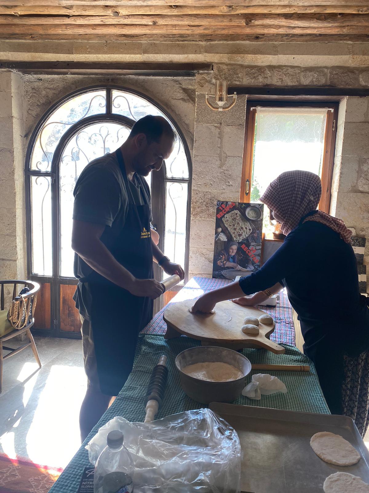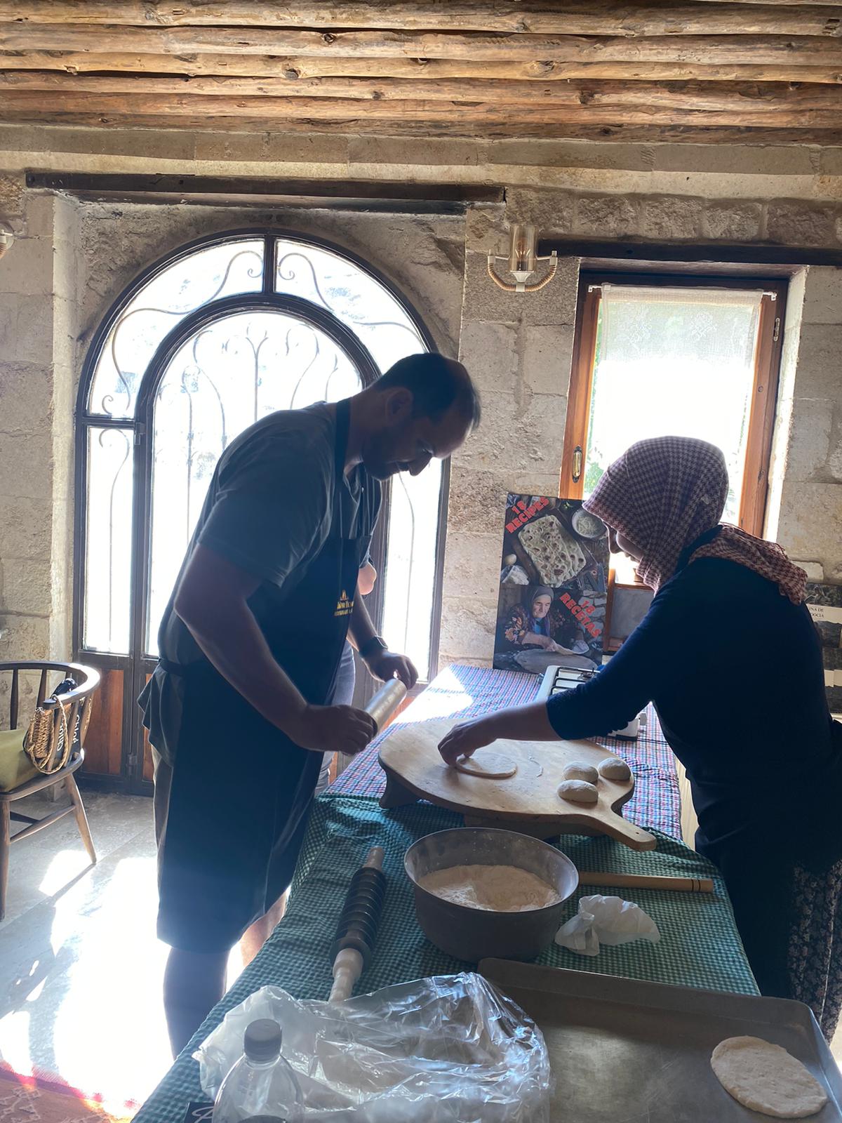 Sabah saat 10 civarında restoranımıza gelmiş oluyorlar; genellikle iş başlangıç saatimiz 10. İlk olarak, bazlama ekmeği ve mantı için hamur yoğruluyor. Ardından yaprak sarması hazırlanmaya başlanıyor. Hamur dinlendikten sonra bazlama ekmeği yapılıyor ve ardından mantı sıkma işlemi gerçekleştiriliyor. İçli köfte için harç hazırlanıyor ve içli köfte yapımına geçiliyor. Eğer testi kebabı istenirse, testi hazırlığı yapılıp pişiriliyor. Bu işlem isteğe bağlı olarak yapılır ve ek ücretlendirme uygulanır. Ayrıca, hazırlık süresi yaklaşık 1 saat daha uzar. Son olarak, tatlı olarak Aside hazırlanıyor.